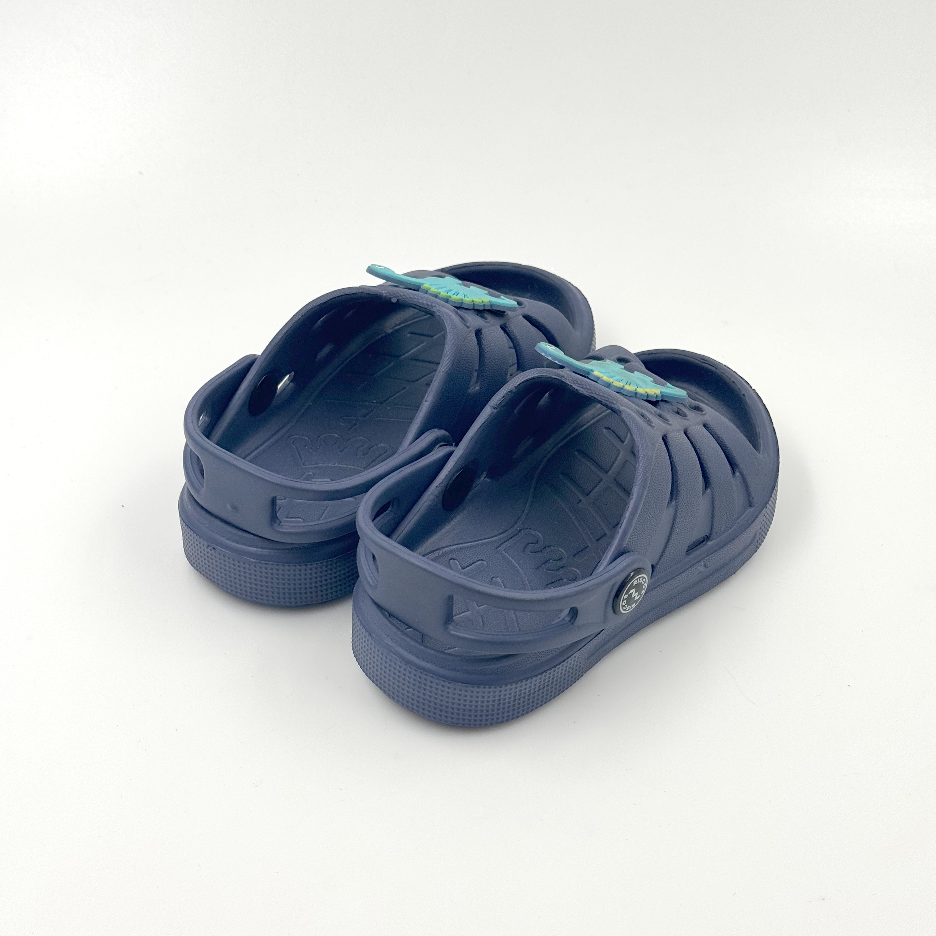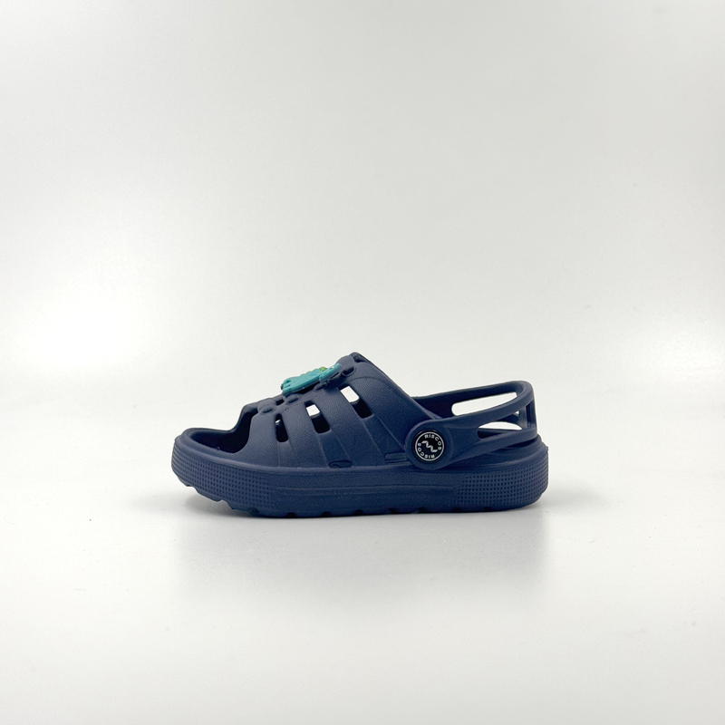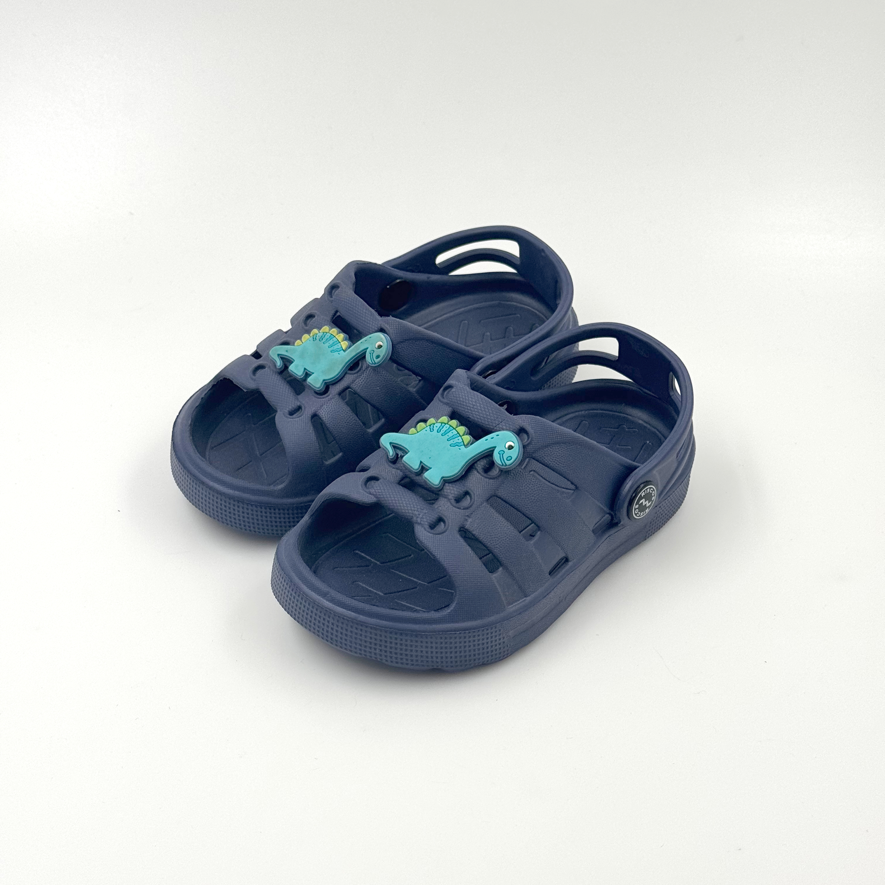 Dark blue children's sandals with dinosaur pattern.