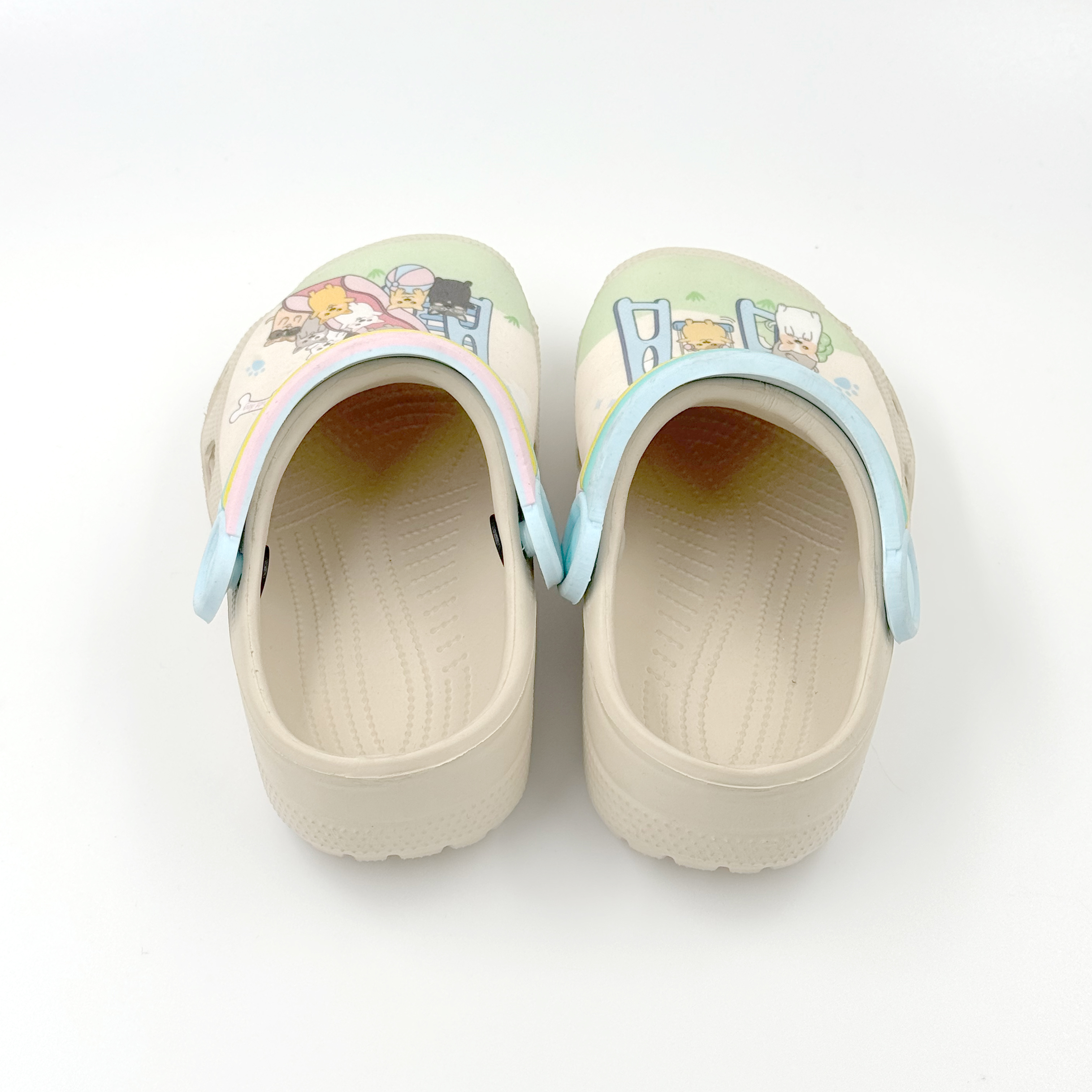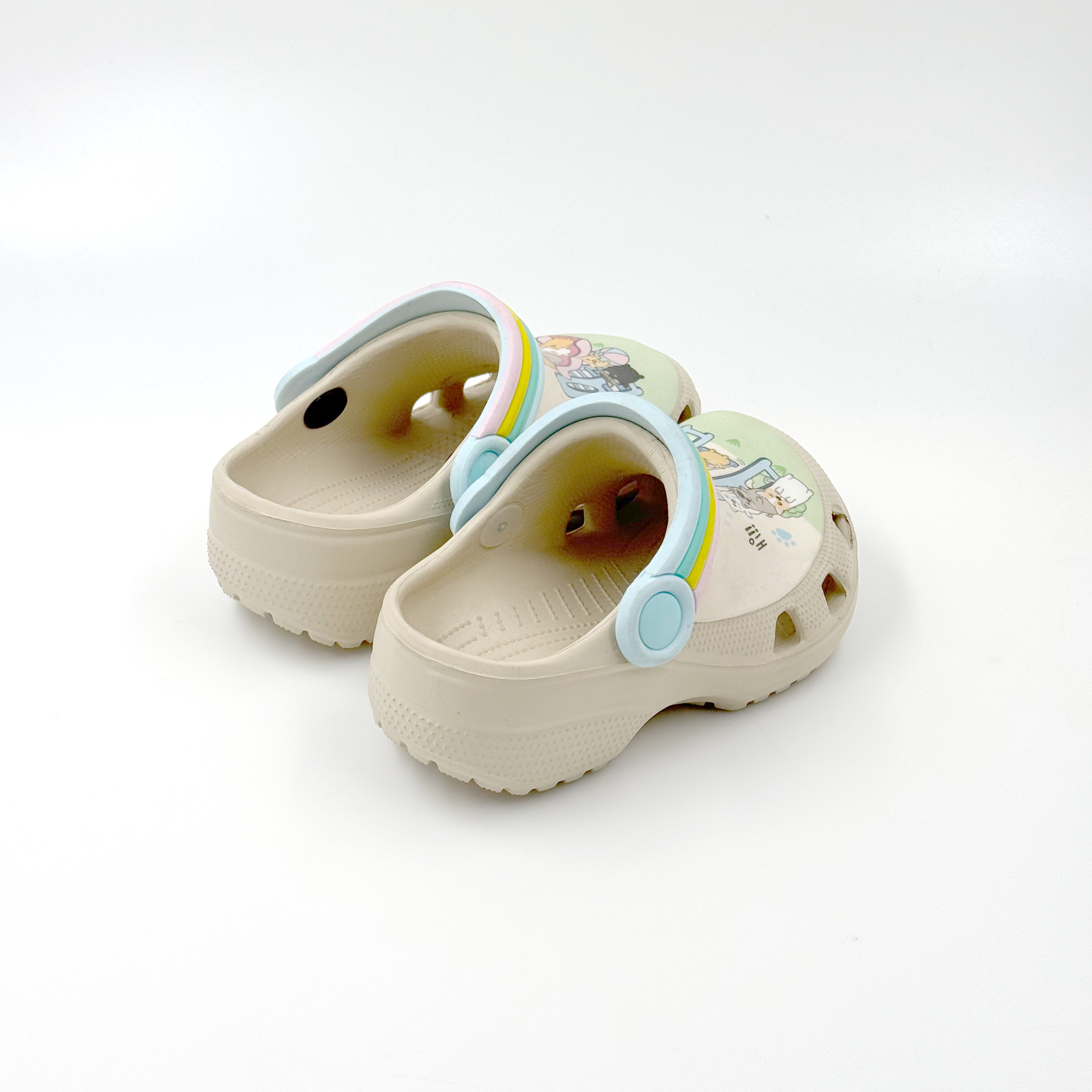 CUTE EVA CLOGS FOR KIDS , CARTOON PRINTING 3D PATCH WITH RAINBOW BACK STRAP ,LOVELY