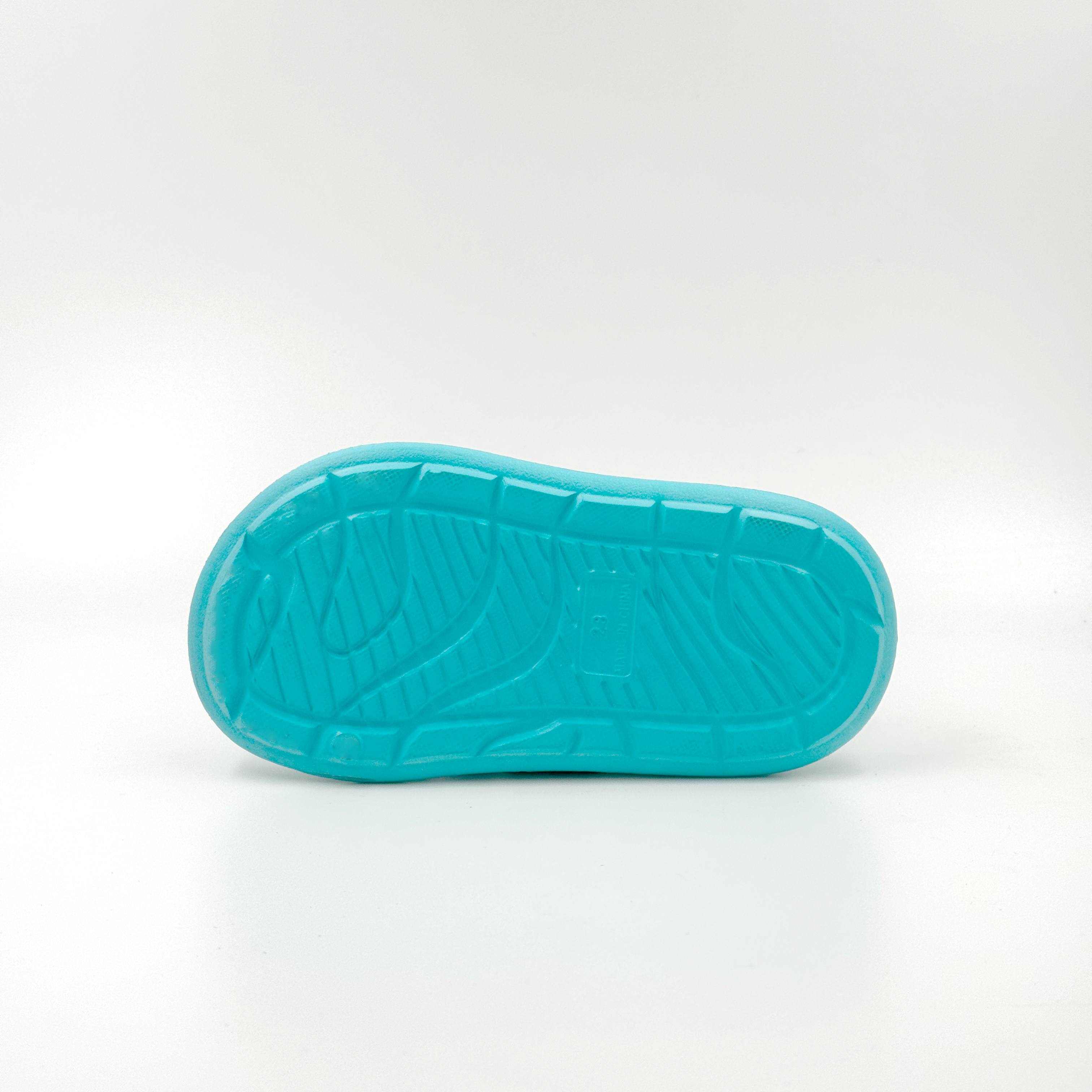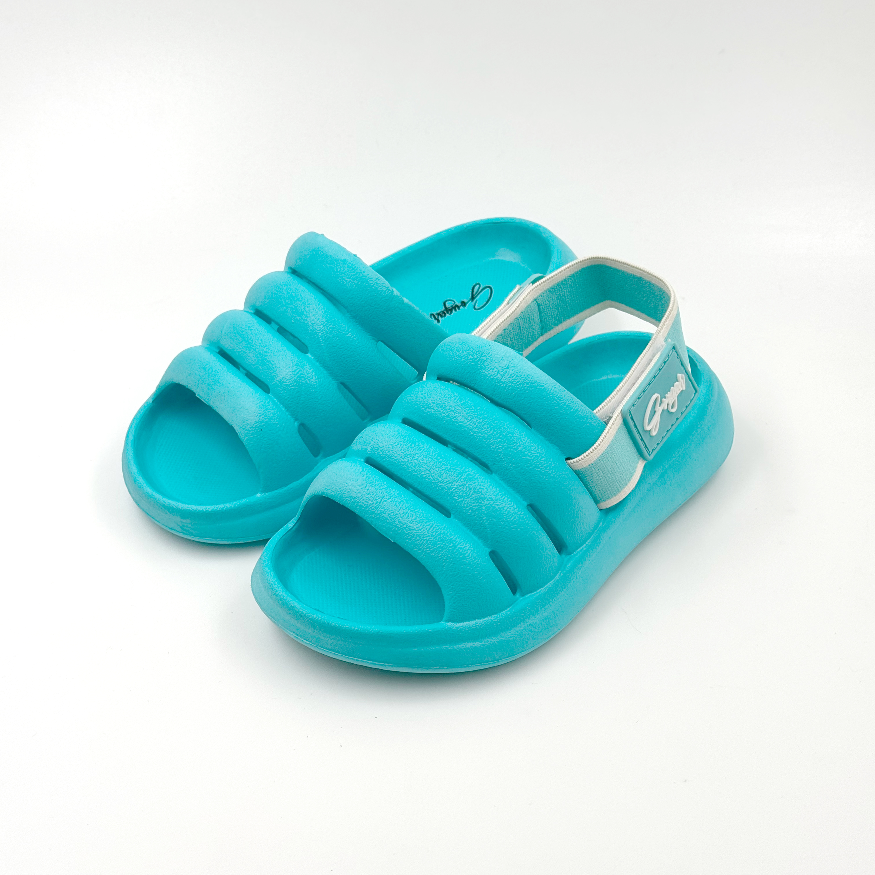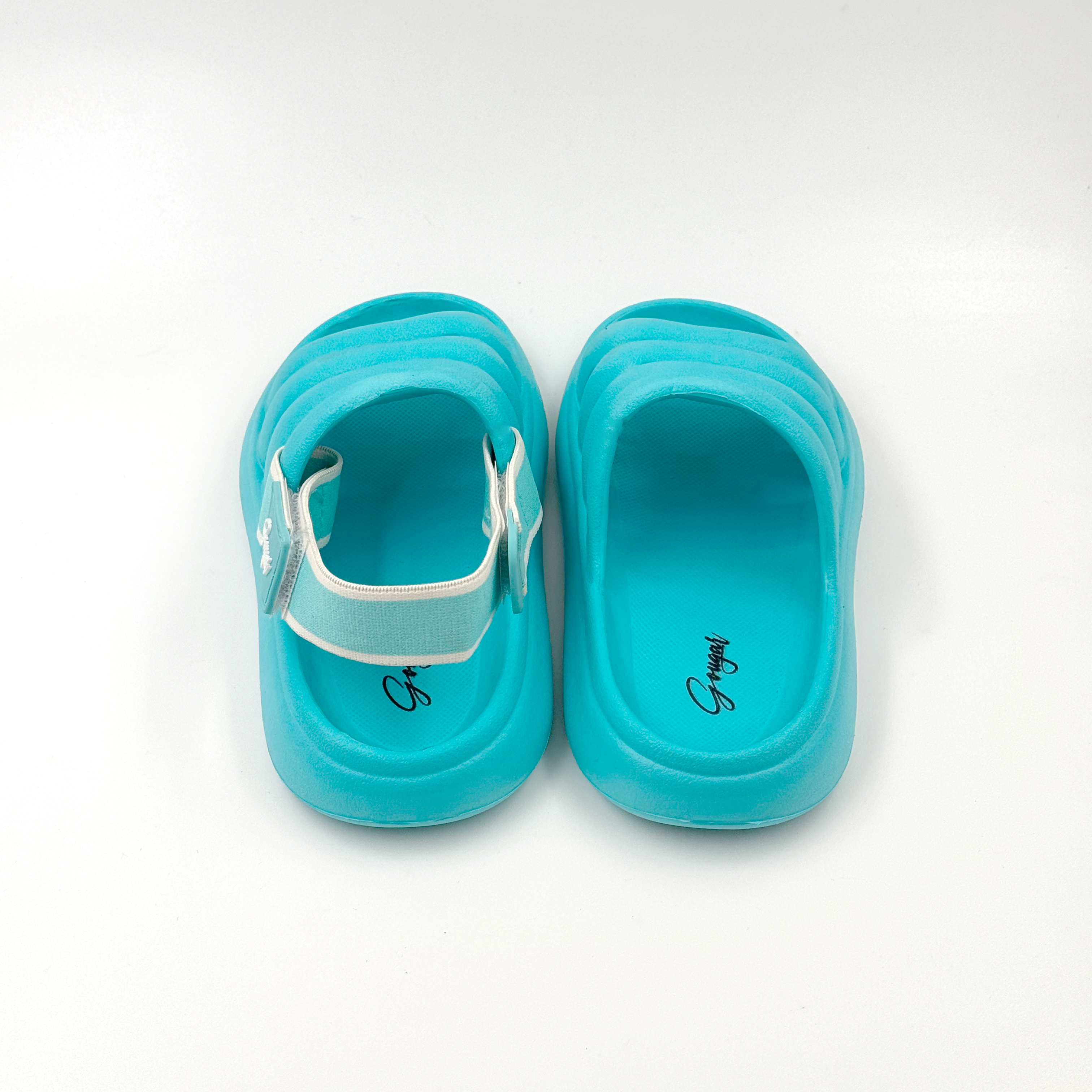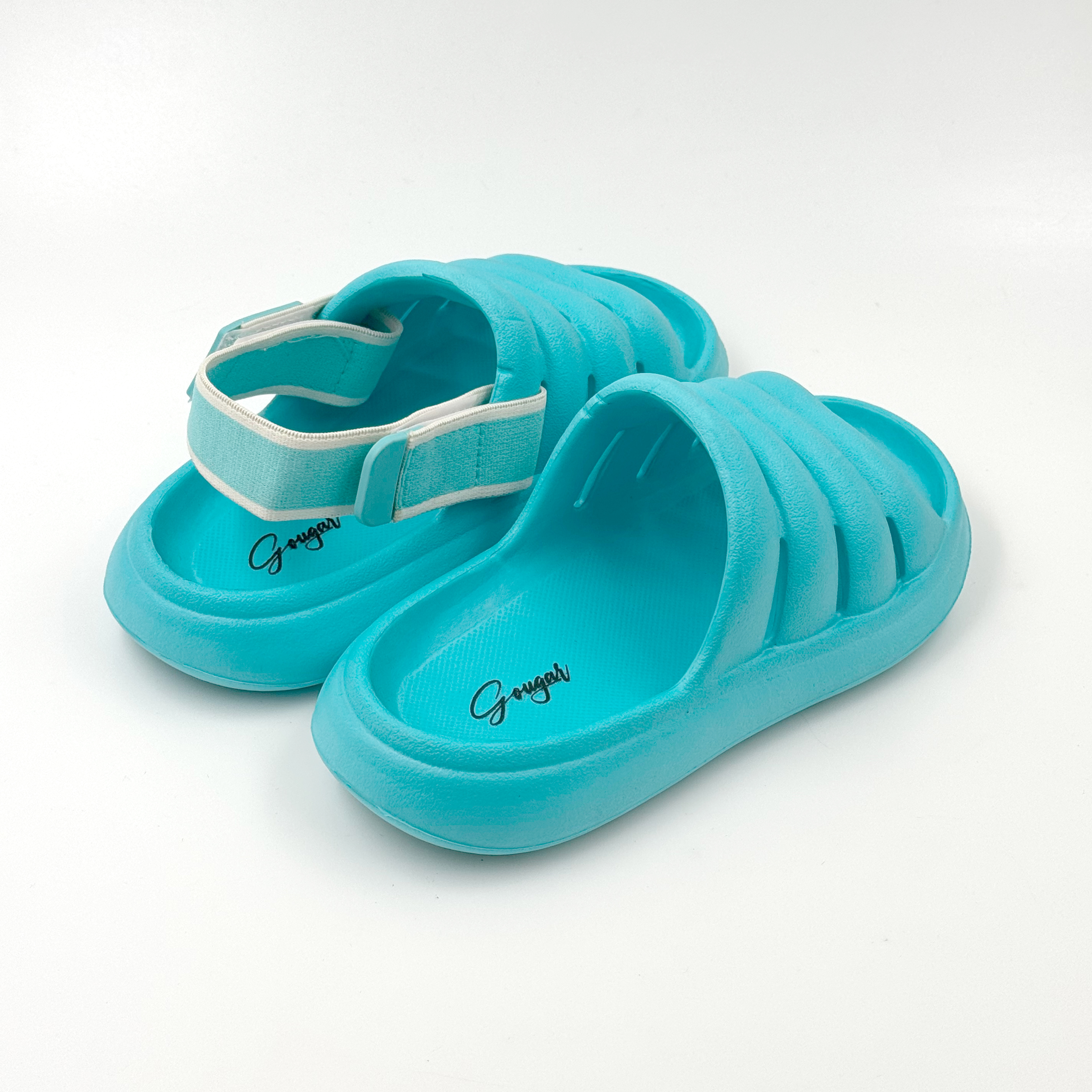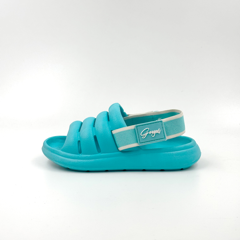Tiffany blue slippers with detachable Velcro straps.